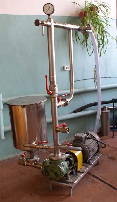 Техническая характеристика гидродинамического кавитационного гомогенизатора: давление жидкости в нагнетательном трубопроводе, МПа 0,4-2,5; давление жидкости на выходе из гомогенизатора, МПа до 0,25; разрежение (вакуум) в зоне эжекции, МПа до 0,08; расход жидкости (по насосу) куб.м/час 4-30; производительность по готовому продукту кг/час до 20000; мощность электродвигателя, кВт 1,0-7,5; габаритные размеры, мм 1200х400х800 масса, кг 50-75 материал сталь 12х18 HIOT ГОСТ 2590-71